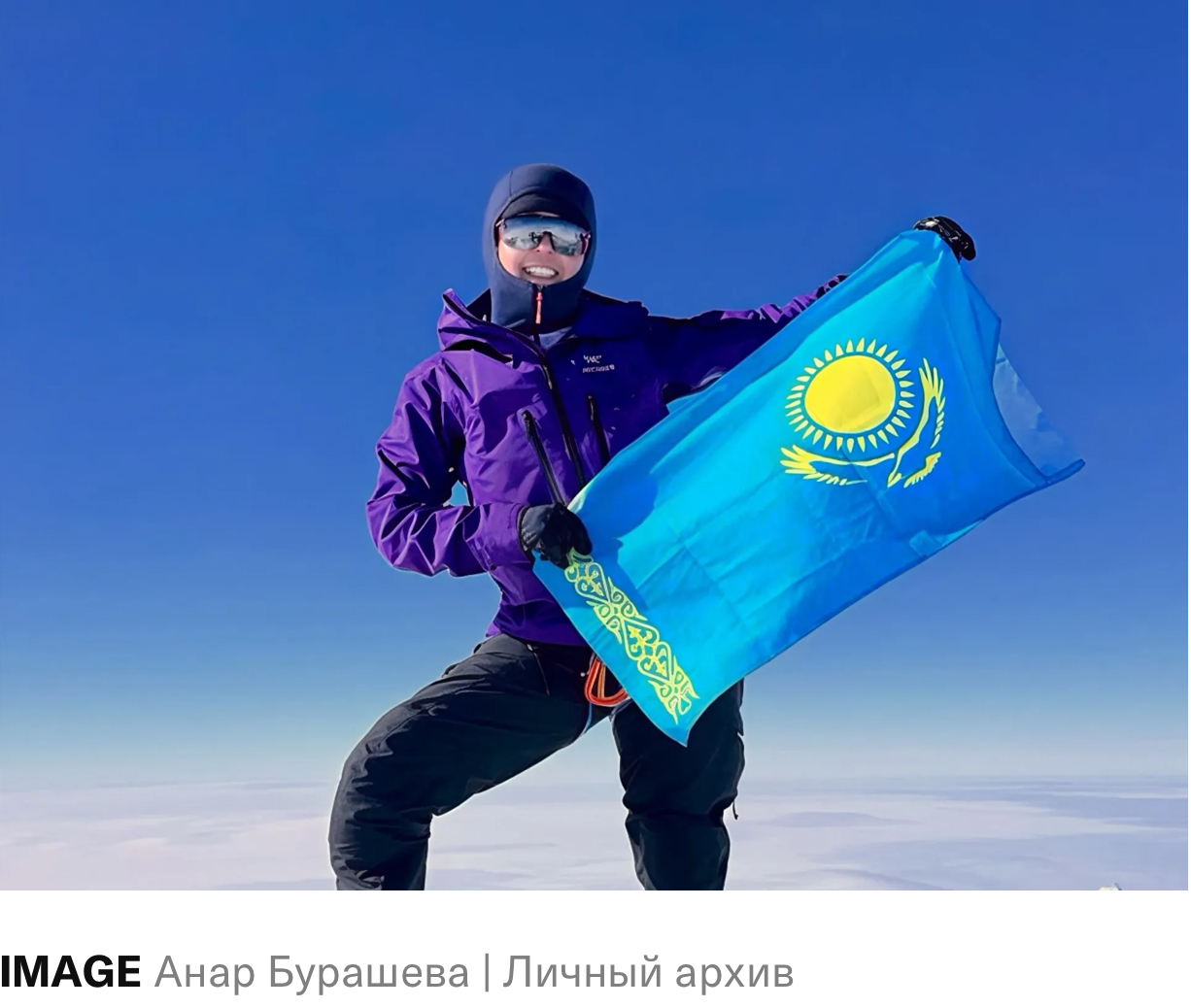 Альпинистка Анар Бурашева поднялась на массив Винсон в Антарктиде и стала первой женщиной в истории Казахстана и Центральной Азии, покорившей все семь высочайших вершин на всех континентах мира и выполнившей программу «Семь вершин» (Seven Summits). Информация об этом появилась на ее личной странице в Instagram.