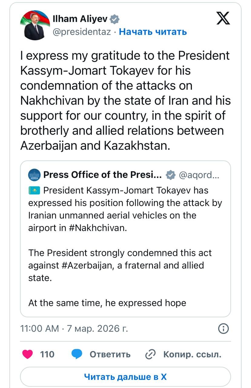 Выражаю благодарность Президенту Касым-Жомарту Токаеву за осуждение нападений на Нахичевань со стороны иранского государства и за поддержку нашей страны в духе братских и союзнических отношений между Азербайджаном и Казахстаном, — говорится в публикации.