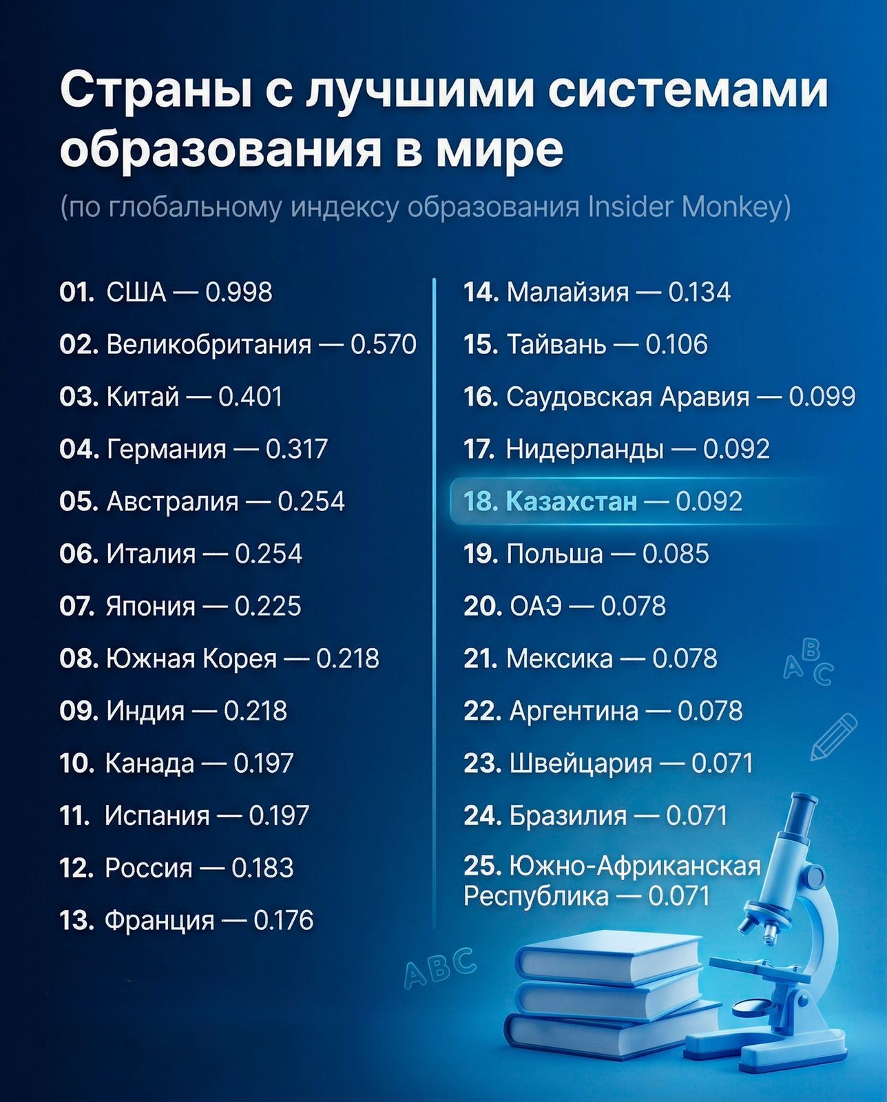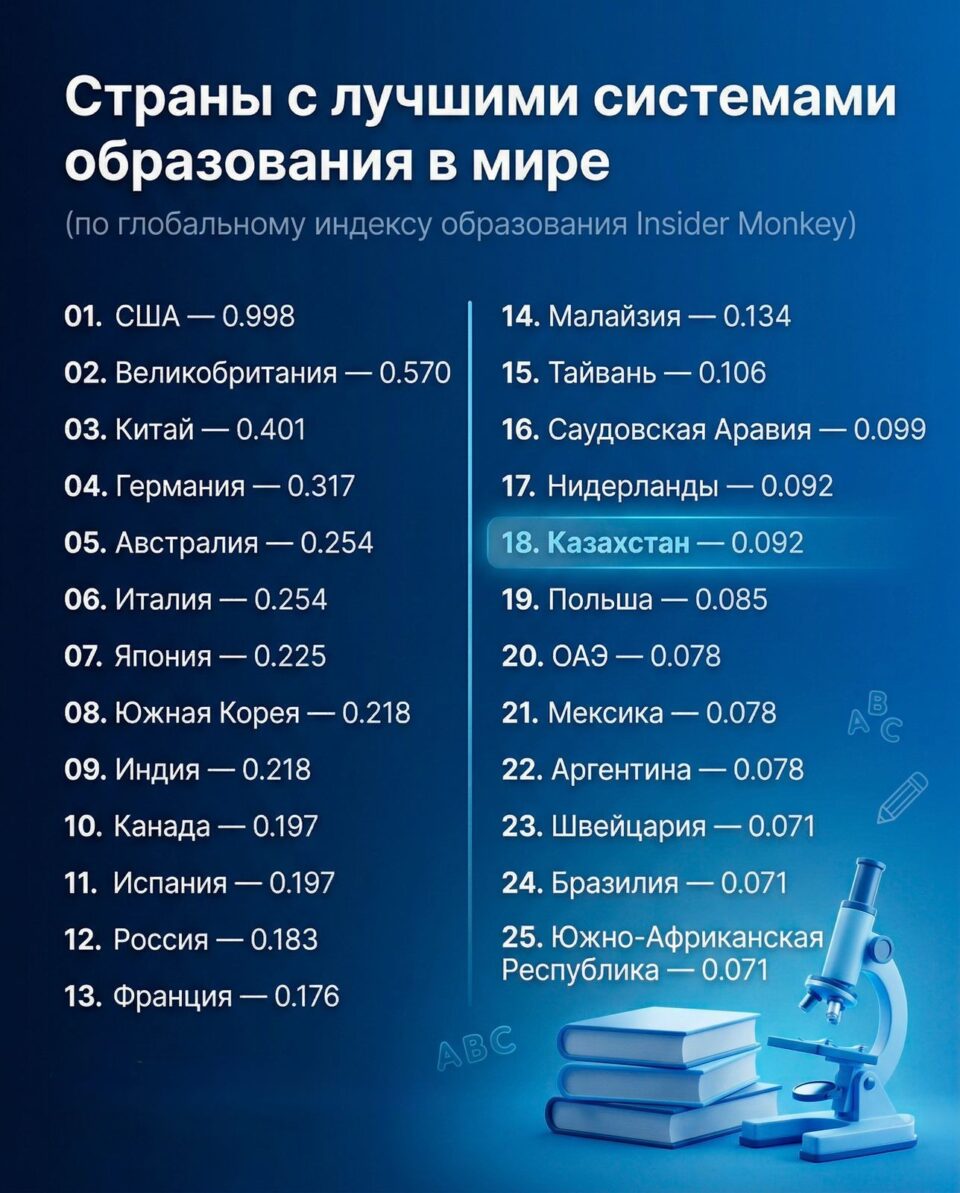 Казахстан занял 18-е место в рейтинге Insider Global Education Index, набрав 0,092 балла и войдя в группу стран с устойчиво развивающимися и международно интегрированными образовательными системами.