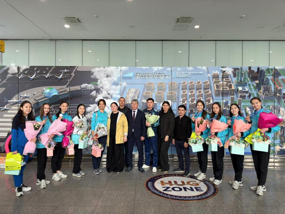 Халықаралық әуежайда спортшыларды Астана қаласы әкімдігінің №1 Балалар мен жасөспірімдердің мамандандырылған олимпиадалық резерв спорт мектебінің ұжымы, ата-аналар мен жақындары зор қошеметпен қарсы алды.
