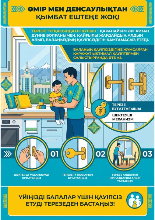 «Қазақстан балалары» тұжырымдамасын іске асыру аясында елімізде «Терезе-SAFE» ауқымды ақпараттық науқаны басалды. Бастаманың мақсаты жазатайым оқиғалардың алдын алып, балалардың терезеден құлауына жол бермеу. Статистикаға сүйенсек, 2025 жылдың қорытындысы бойынша мұндай оқиғалар 2023 жылмен салыстырғанда 1,8 есеге артқан. Қауіп тобында негізінен 2 мен 5 жас аралығындағы бүлдіршіндер тұр.